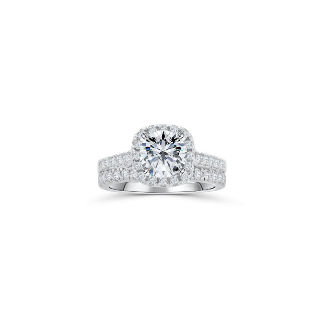 – Hand-crafted cushion halo engagement ring set featuring a 1.5 ct round-cut center stone and half-eternity wedding band.