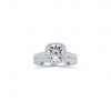 – Hand-crafted cushion halo engagement ring set featuring a 1.5 ct round-cut center stone and half-eternity wedding band.